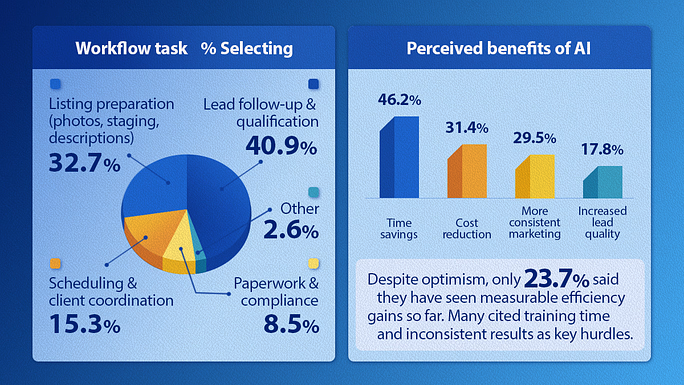 AI has clearly entered the marketing phase of real estate. Still, less than one in three agents rely on it consistently, indicating an early-majority adoption curve - not full integration.